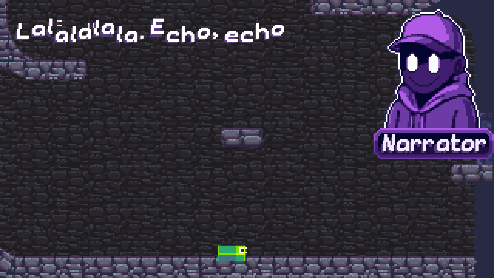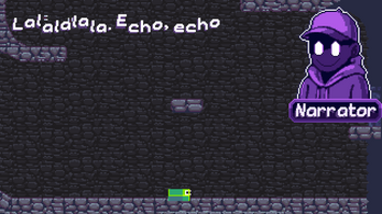 Nosso intuito será colocar um narrador no jogo para dar um tom de comédia e explicar quando necessário mecânicas para o jogador. No exemplo descrito de "rotacionar no ar" é uma mecânica para que o jogador tenha que aterrissar no chão horizontalmente, e para certas partes do jogo onde ele precisará controlar a rotação para poder passar por lugares mais estreitos.